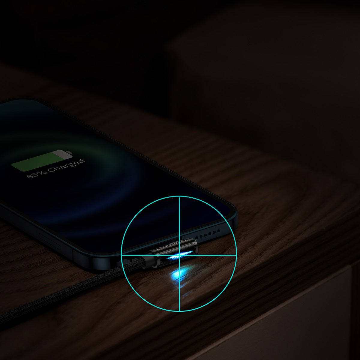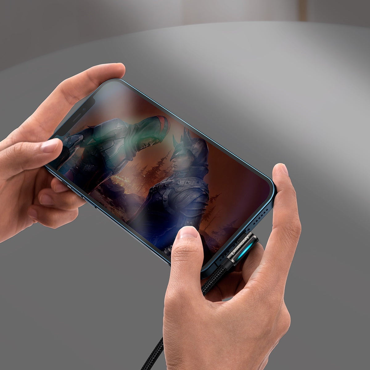 Now you can comfortably charge your phone while you play - the protruding cable will no longer get in your way. The 90? curve of the plug makes the product fit the shape of your smartphone better. The accessory is equipped with a flashing blue light, which indicates the charging status. It also gives the cable a unique, gaming character.