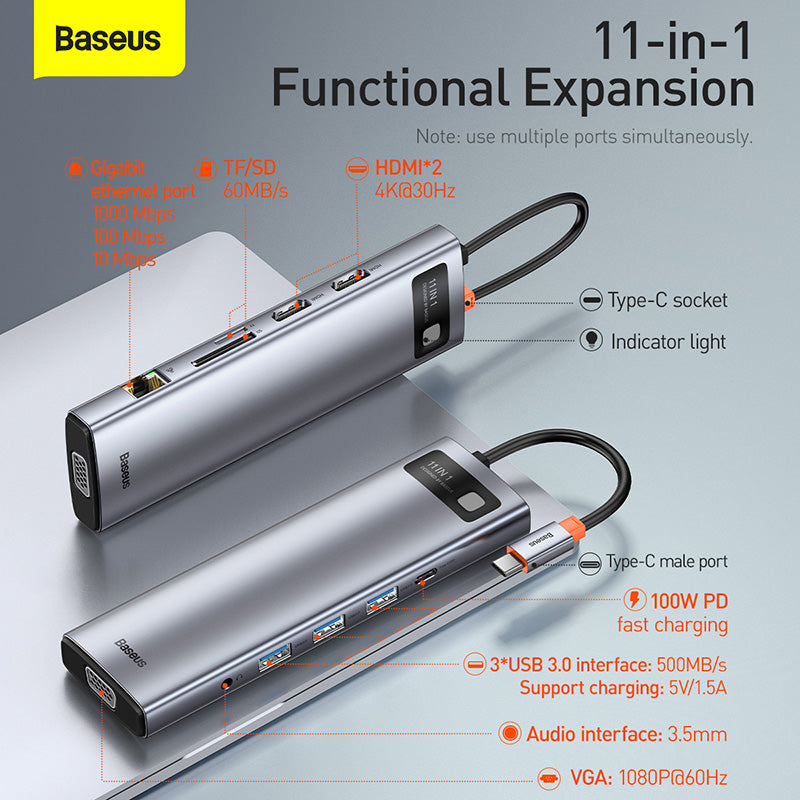 Baseus Metal Gleam 11 in 1 Multifunctional USB Type-C Hub Grey (CAHUB-CT0G)