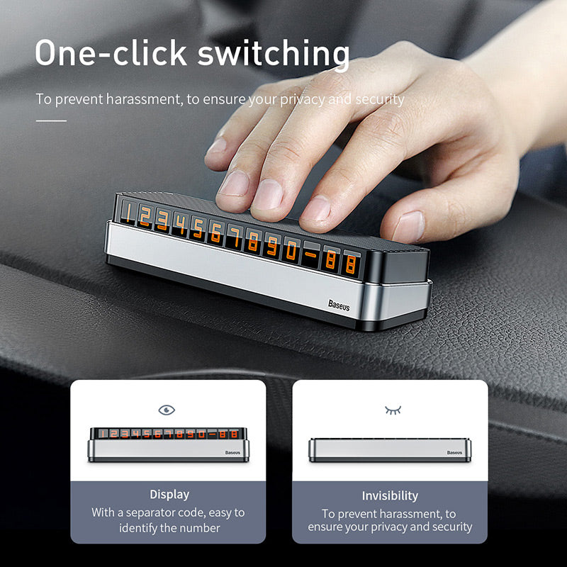 Baseus Moonlight is a handy temporary parking number plate for daily use. It features highly visible orange numbers that can easily be read during the day or night. High-quality aluminum alloy provides aesthetically pleasing housing that will blend into any car interior. One-click switching opens and closes the parking number plate protecting your privacy.