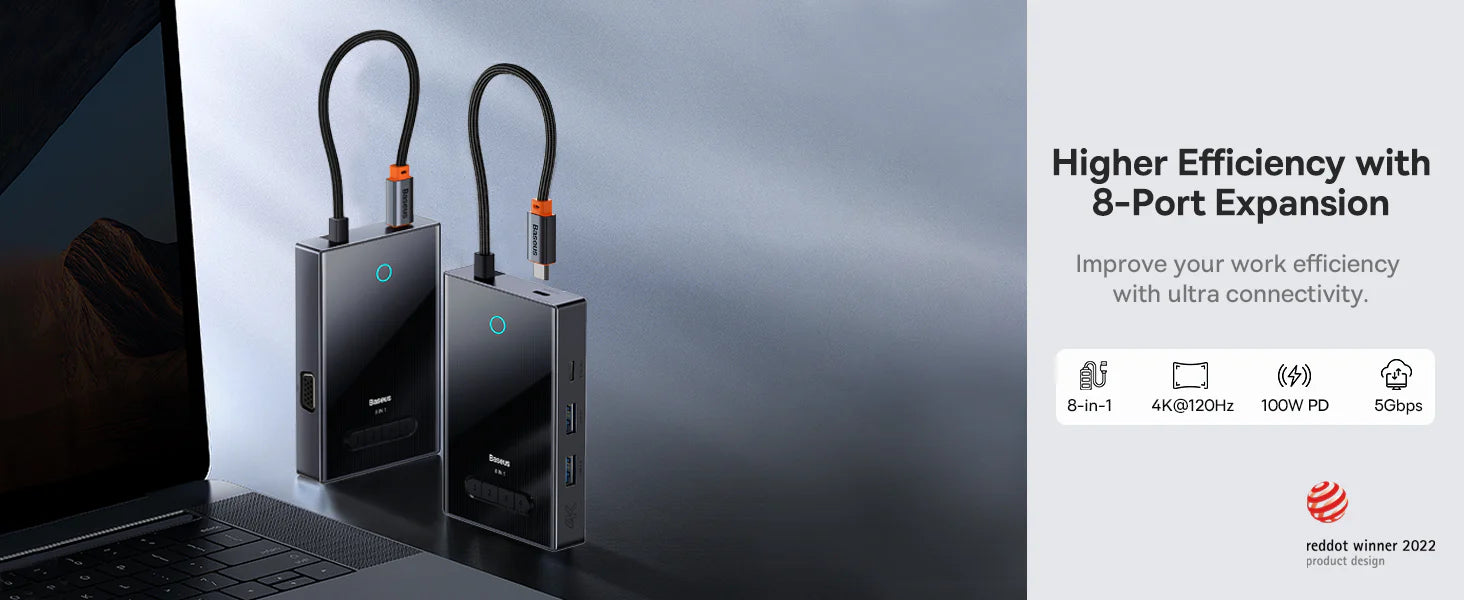 PioneerJoy 8 Ports Hub supports up to 4 screens and delivers exceptional 4K@120Hz for editing or gaming with unrivaled clarity. It has 100W PD input for fast laptop charging and 20W Type-C output for other devices.