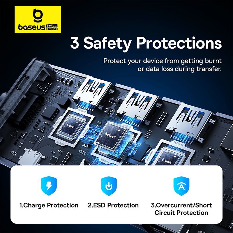 Your safety is a priority, which is why the Baseus UltraJoy 7-in-1 Hub is equipped with various protections, such as charging protection, surge protection, protection against excessive voltage, and short-circuit protection. You can rest assured that your devices are safe when using this hub.
