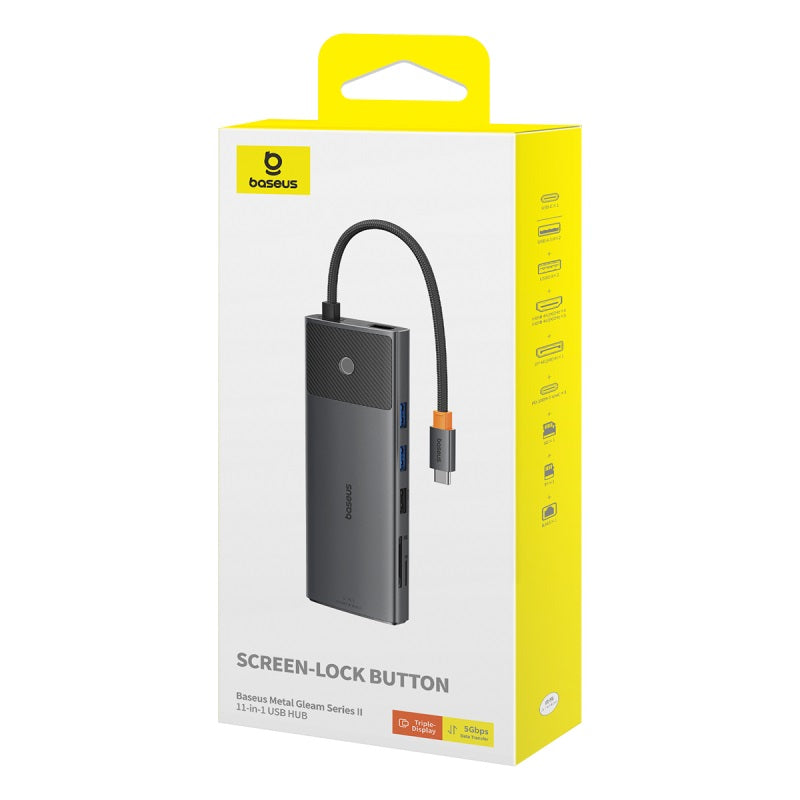 The Baseus Metal Gleam HUB USB-C 11-in-1 Adapter is a compact device that can significantly expand the capabilities of your laptop or desktop computer. Constructed from durable aluminum alloy, it not only looks great but is also robust and ready for daily use. With lightning-fast data transfer and charging capabilities, the ability to work on triple screens, simultaneous SD/TF3.0 card reading, and a screen-off button, this hub becomes an invaluable tool both at work and at home. Its 85mm cable length, compact dimensions (145 x 51 x 12 mm), and lightweight design (approximately 120g) make it easy to take with you wherever you need it.
